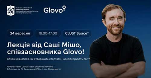 24 вересня в SMART-УКРИТТІ Науково-технічної бібліотеки КПІ ім. Денисенка (Smart Shelter CLUST Space) відбулася надихаюча лекція від співзасновника міжнародного сервісу доставки Glovo — Саші Мішо.
